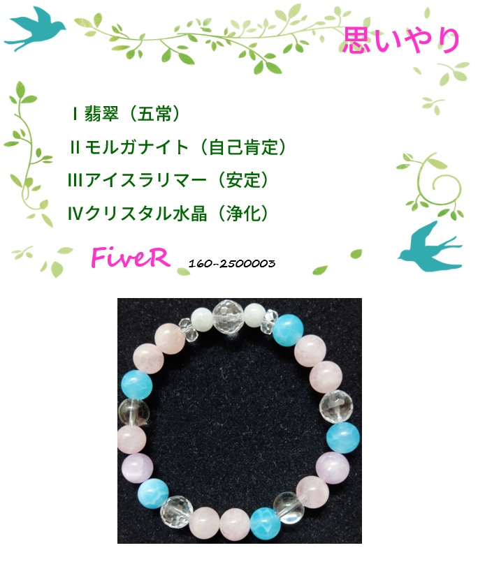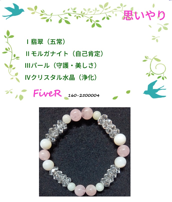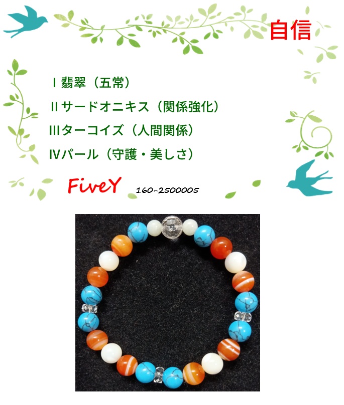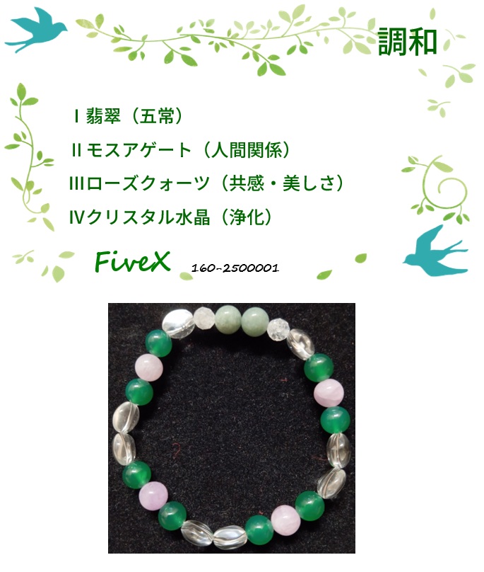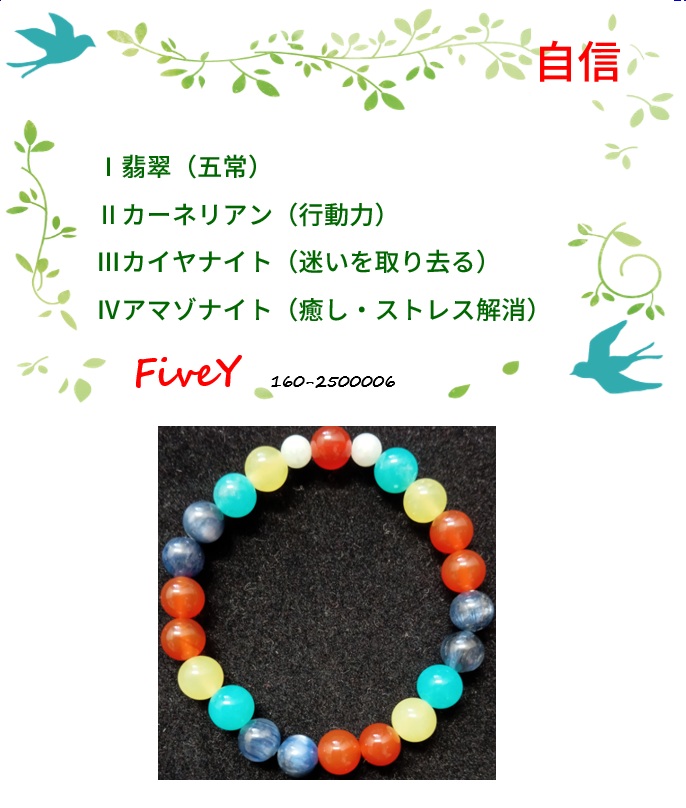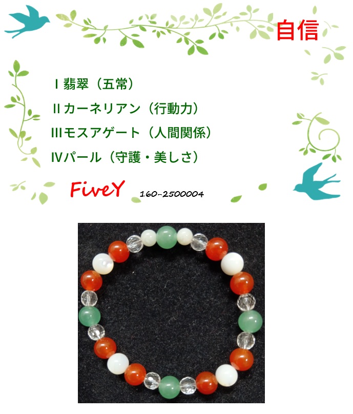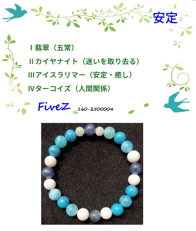 - 厳選した品質の良い天然石を、5つの思い(思いやり、調和、自信、安定、豊かさ)に分けて、一つ一つ丁寧にお作りします。世界で一つ、オーダーメイドも可能にしました。